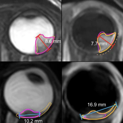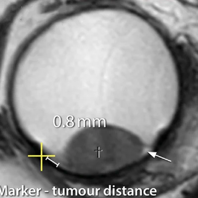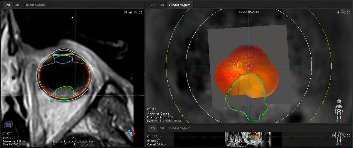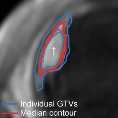 Conventionally ocular proton therapy is planned using a mathematical eye and tumour model, based on 2D ultrasound measurements and tantalum clips which are sutured to the eye wall. With our high resolution MR-images of the eye, we are working on an image-based form of planning, enabling a more conformal treatment, thereby sparing more of the patient’s vision. This, however, raises the bar on the accuracy and consistency of our methods, as we have to guarantee the high level of 98% of local control.